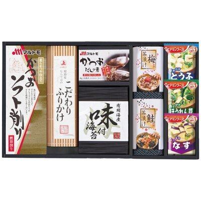 現品サイズ・内容:マルトモかつおソフト削り(2g×4袋)・こだわりふりかけ(6g×3袋)・マルトモかつおだしの素(8g×3袋)・有明海産味付海苔(8切8枚2袋)・梅茶漬け(4.3g×2袋)・鮭茶漬け(4.7g×2袋)各1個・アマノほうれん草おみそ汁7g・アマノとうふおみそ汁10g・アマノなすおみそ汁9.5g各1袋